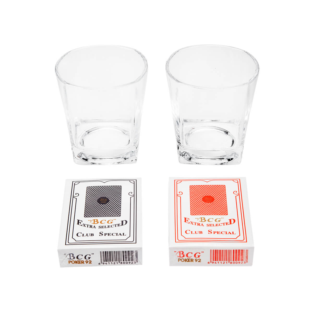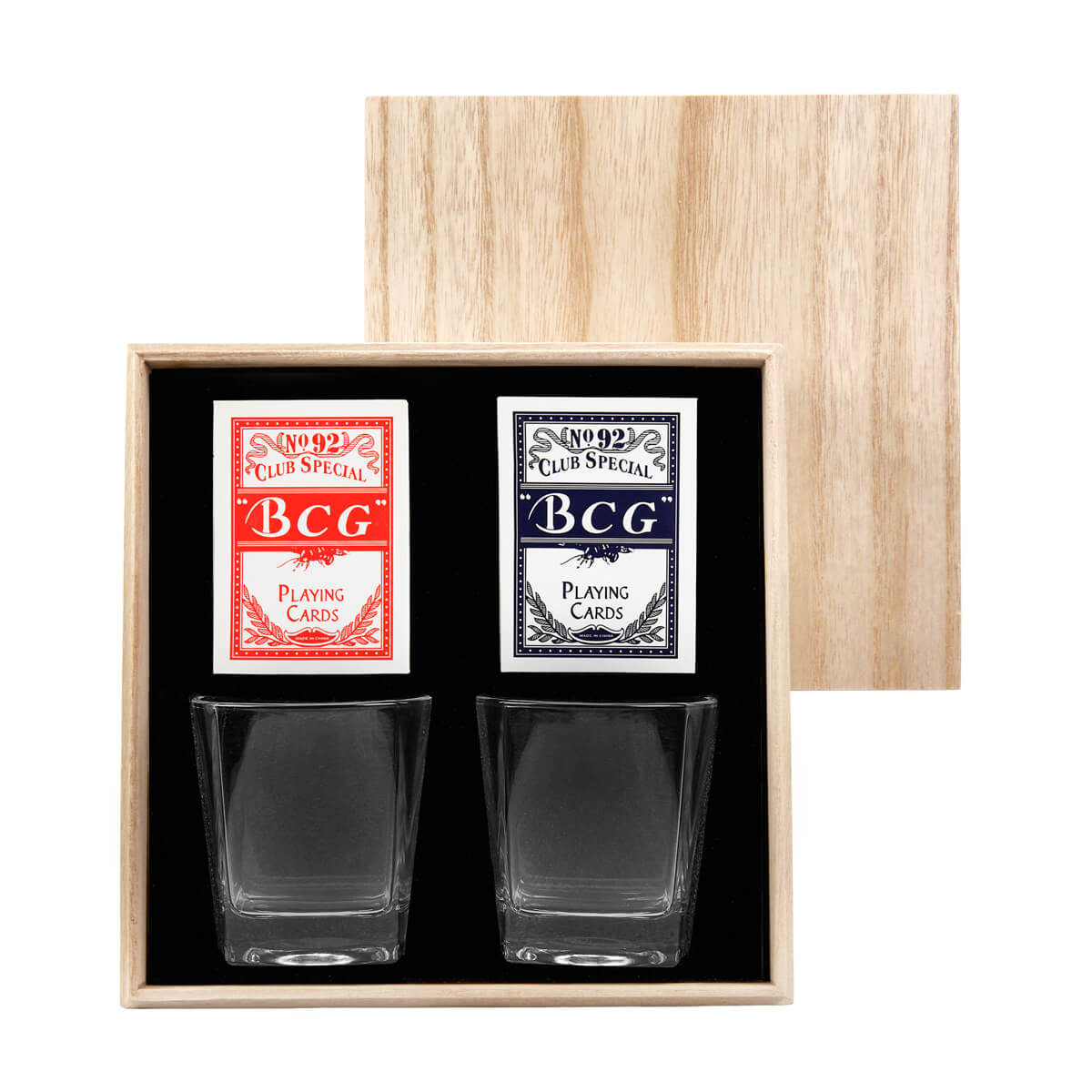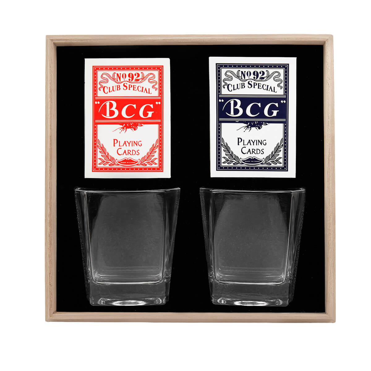 | Descripción | Set de bar con 2 vasos whiskeros de cristal y 2 barajas para juego. Su presentación lo hace perfecto para ocasiones especiales, desde celebraciones personales hasta un obsequio corporativo. Incluye estuche de madera. |