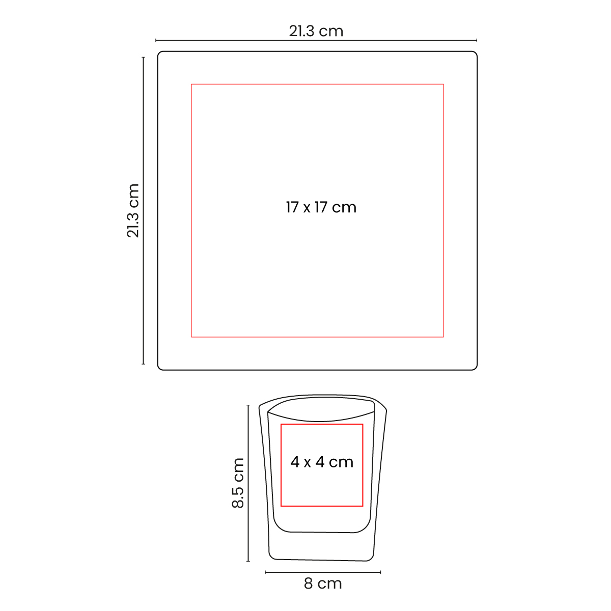 | Area de impresión | 17 x 17 cm Estuche / 4 x 4 cm Vasos |