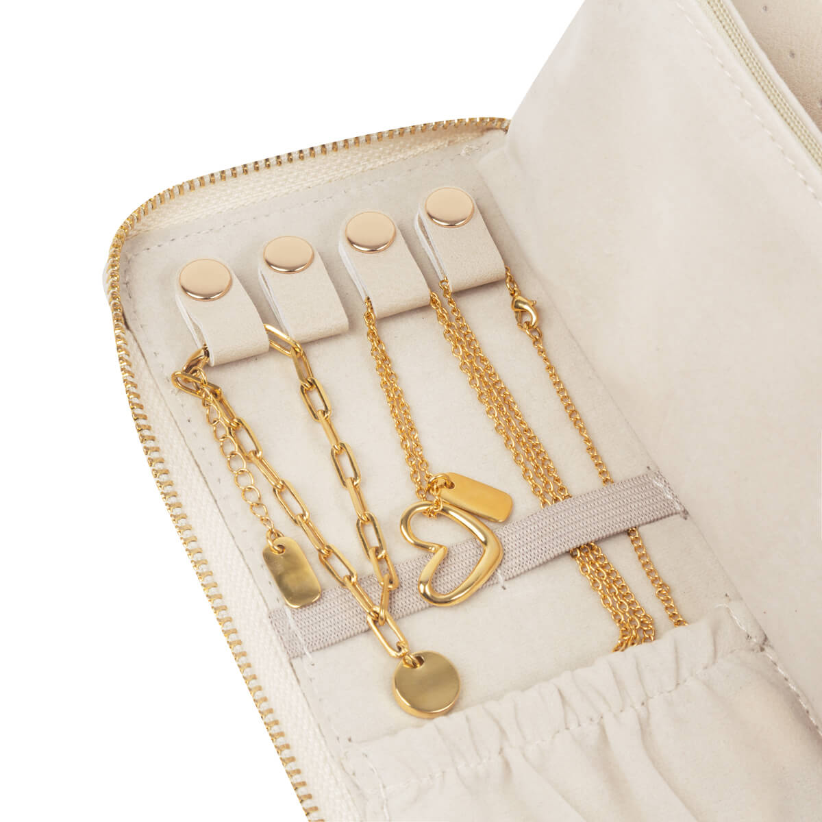 Descripción Organizador de joyería para viaje con diseño tipo cartera. Cuenta con múltiples compartimentos internos para organizar anillos, aretes, collares y pulseras, incluyendo ganchos metálicos, bolsillo con cierre y bandas con broches. Cierre completo y formato compacto para llevarlo en bolsa o maleta sin ocupar mucho espacio.