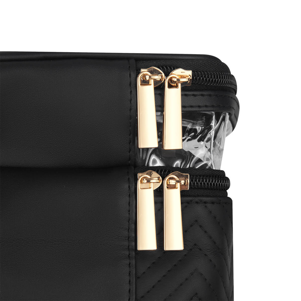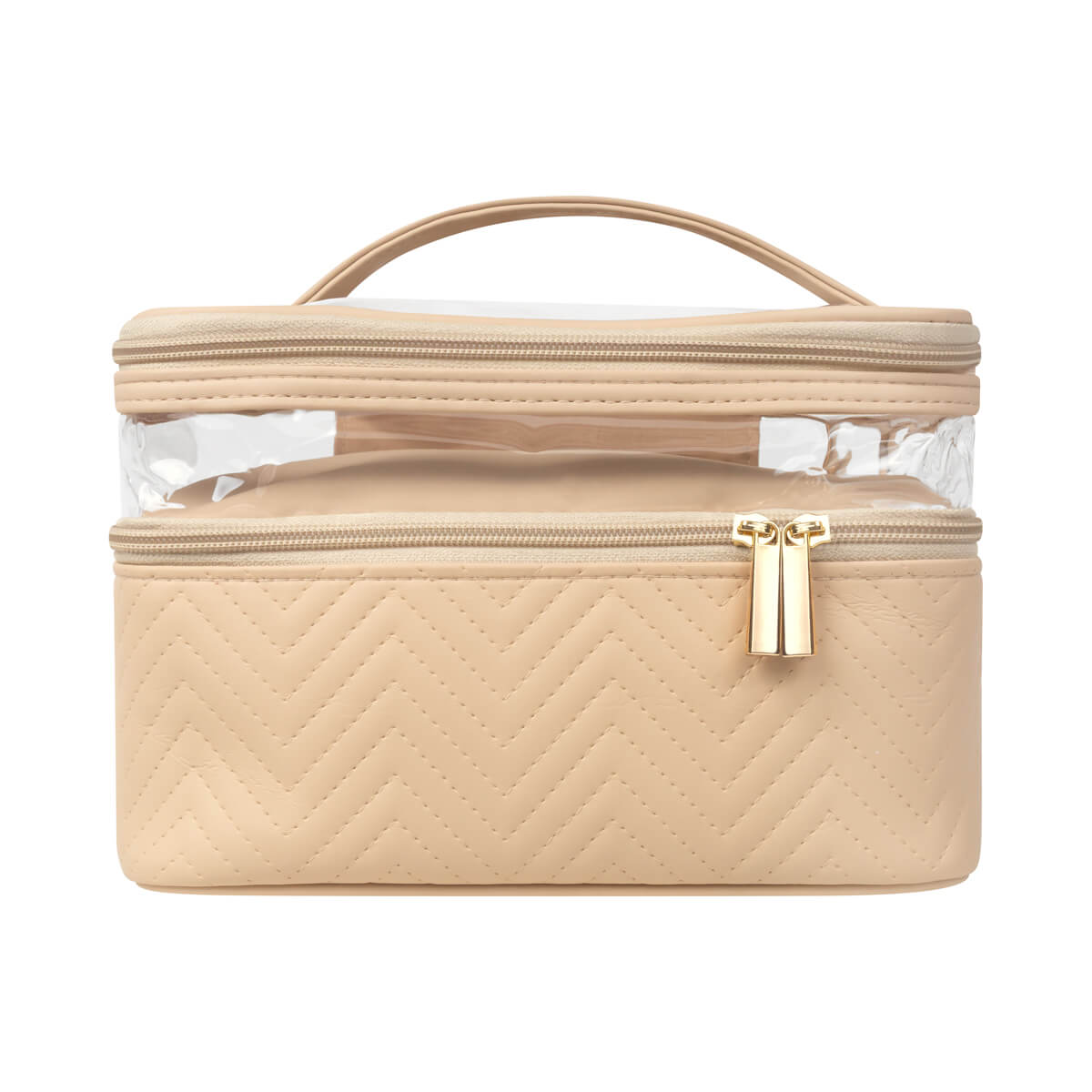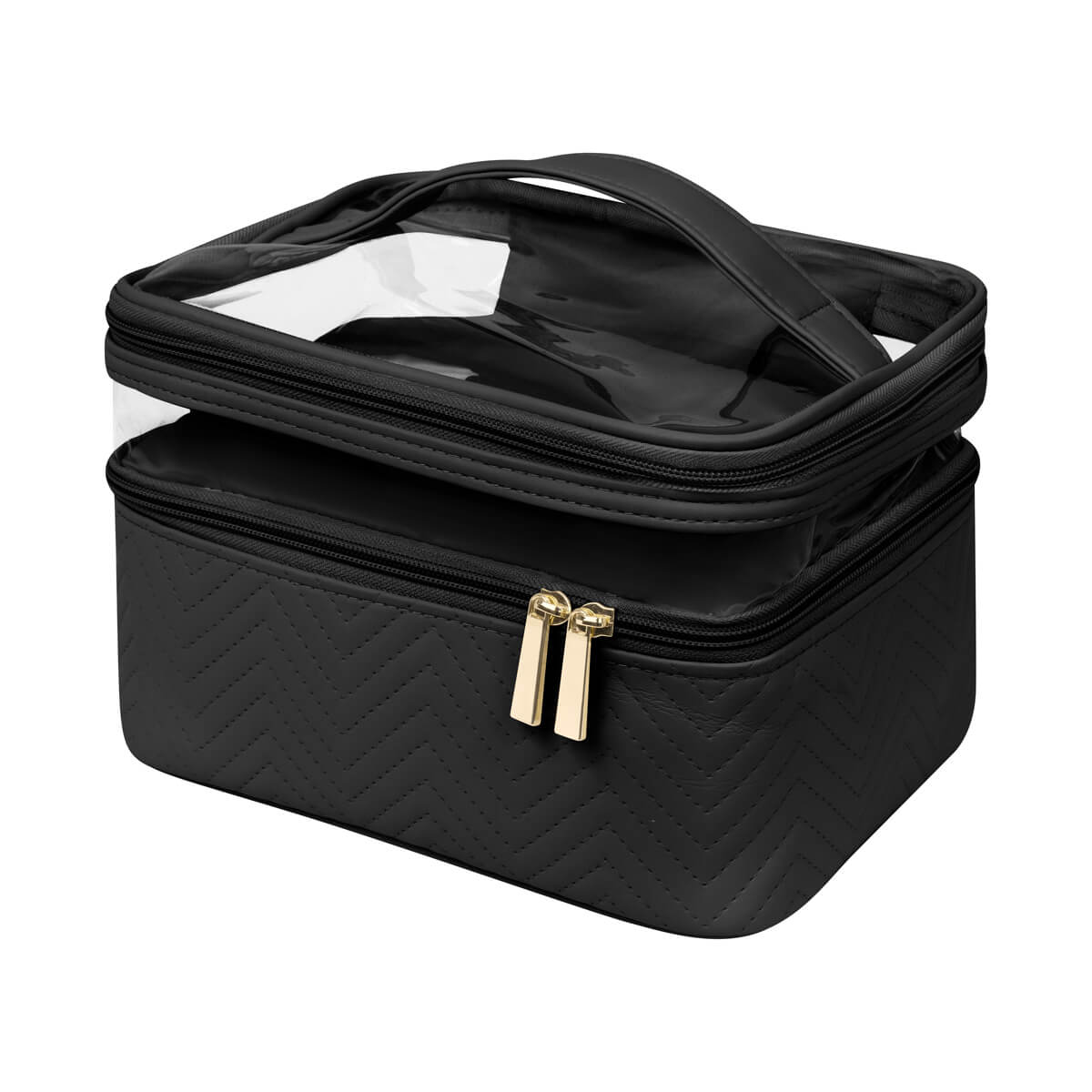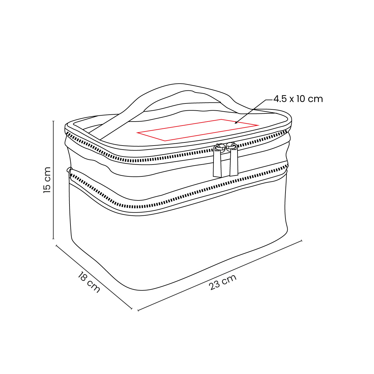 Descripción Neceser fabricado en PU con cuerpo semirrígido. Cuenta con dos niveles con cierre, ideales para organizar y separar productos de belleza o higiene personal. Su panel superior de mica transparente permite visualizar el contenido fácilmente, mientras que el asa facilita su transporte. Ideal para guardar productos de belleza, cuidado personal o maquillaje.