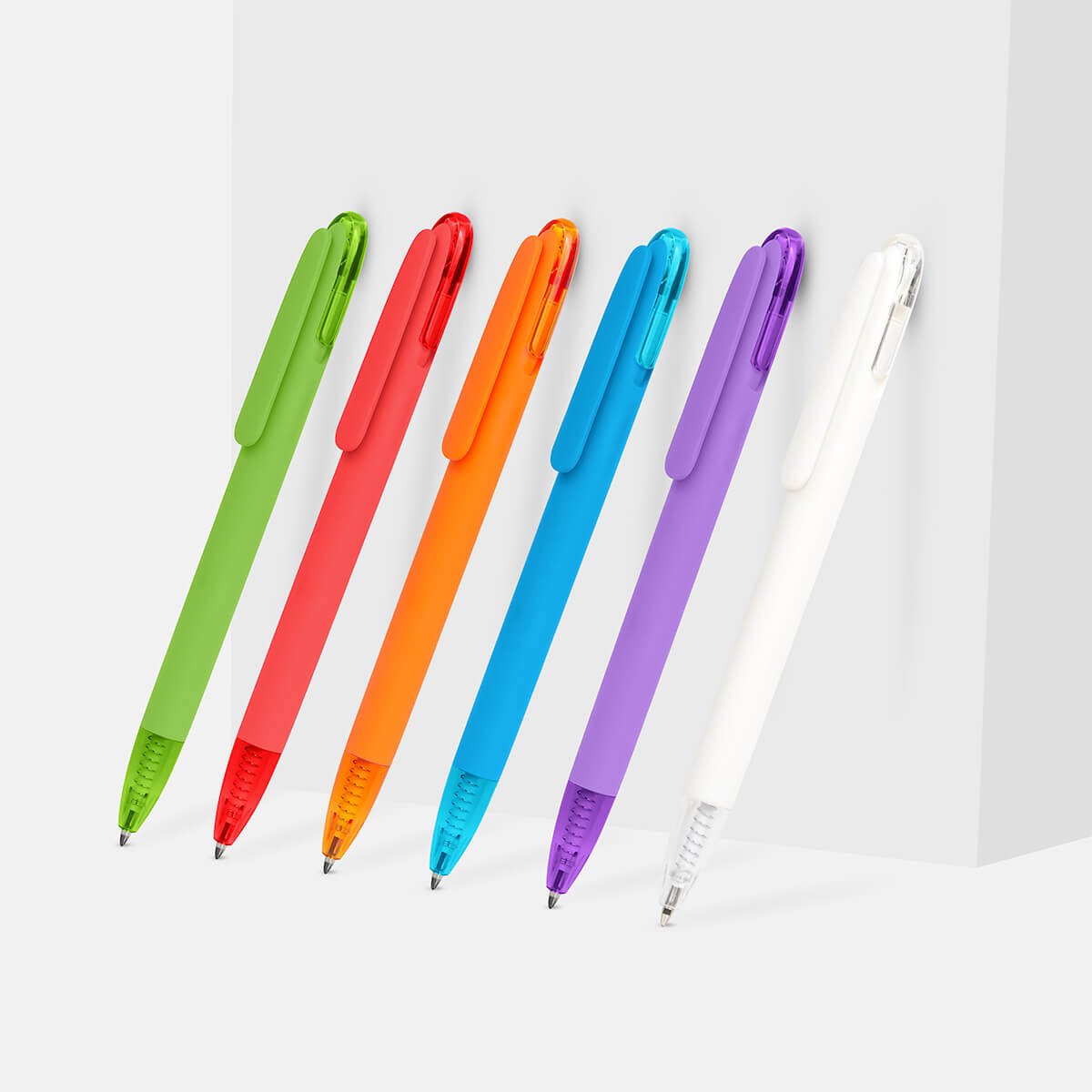 | Descripción | Bolígrafo de plástico acabado rubber, tinta de gel y goma touchs creen. Incluye tapa con clip y espacio que sirve como soporte para celular. |