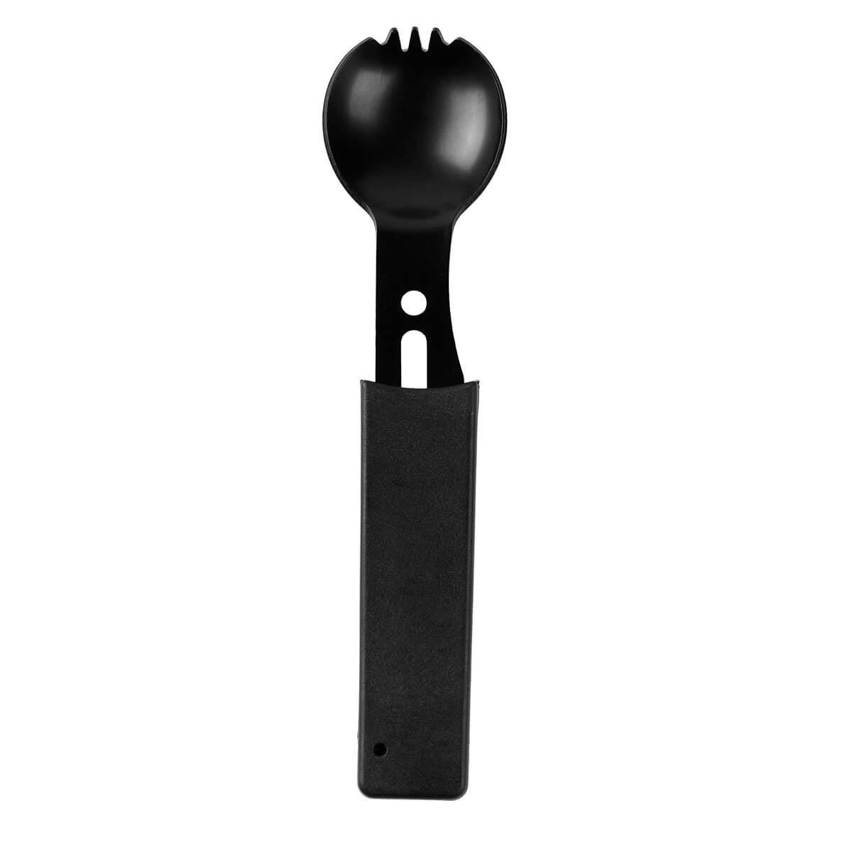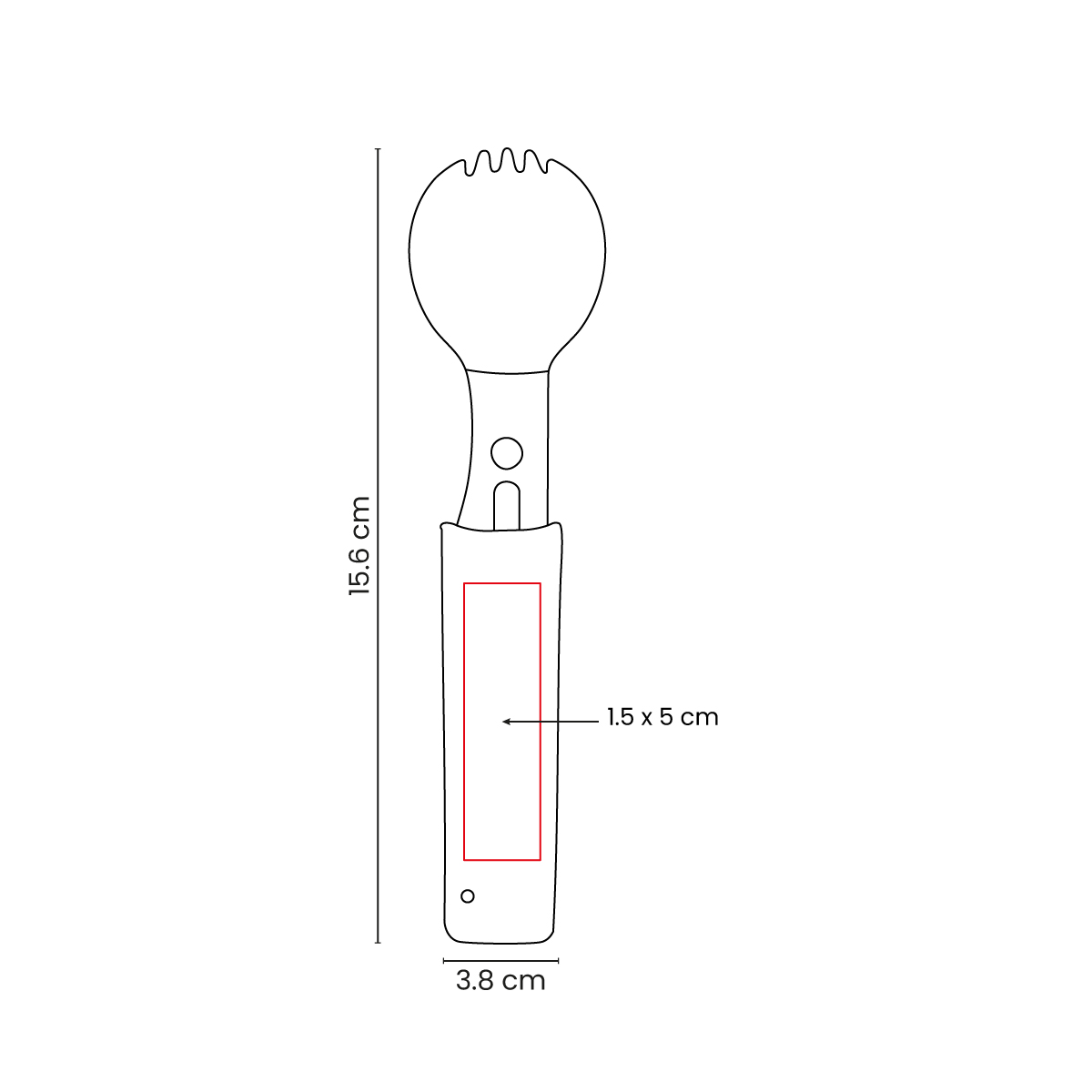 Descripción Cubierto metálico multifuncional que integra tenedor, cuchillo, destapador, desescamador, orificio para cuerda y silbato de emergencia. Ligero, práctico y listo para acompañarte en cada aventura.
