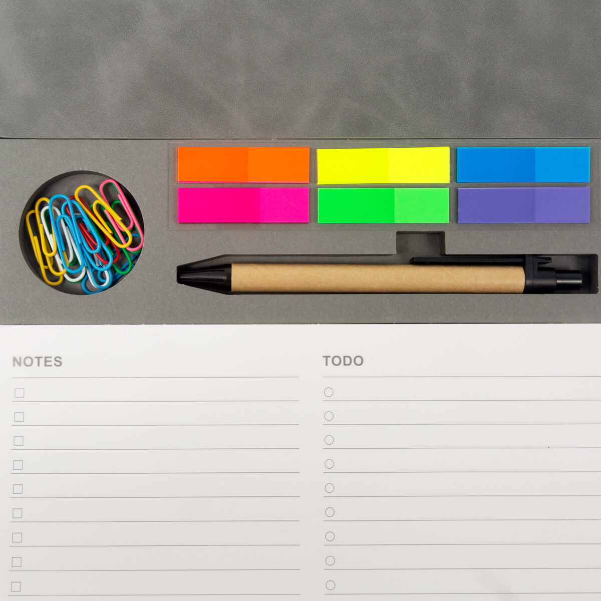 | Descripción | Porta notas de curpiel con sistema plegable que se convierte en soporte para smartphone y organizador de bolígrafos. Incluye un bolígrafo ecológico, 9 clips metálicos, block con 80 notas y banderillas adheribles de 6 colores. Ideal para mantener todo a la mano en escritorio o reuniones. |