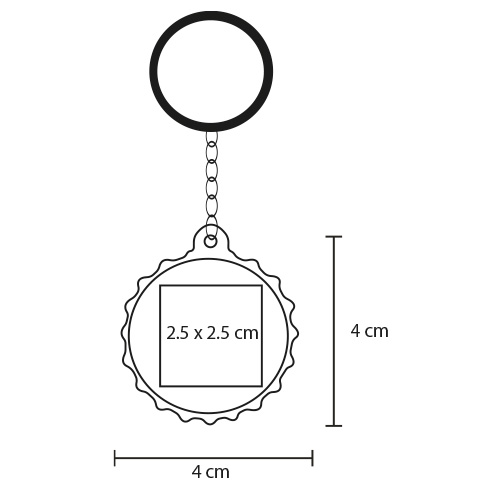 Descripción Llavero metálico con destapador en forma de corcholata y aro.