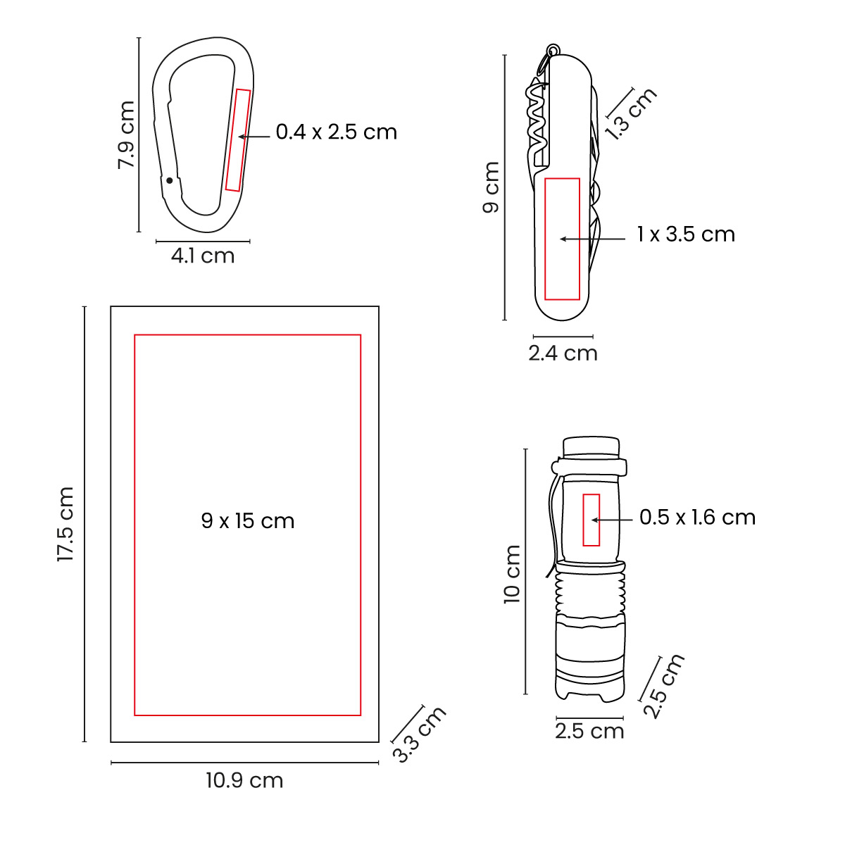 4.1 x 7.9 cm Carabina 2.4 x 9 x 1.3 cm Navaja 2.5 x 10 x 2.5 cm Lámpara 10.9 x 17.5 x 3.3 cm Caja |