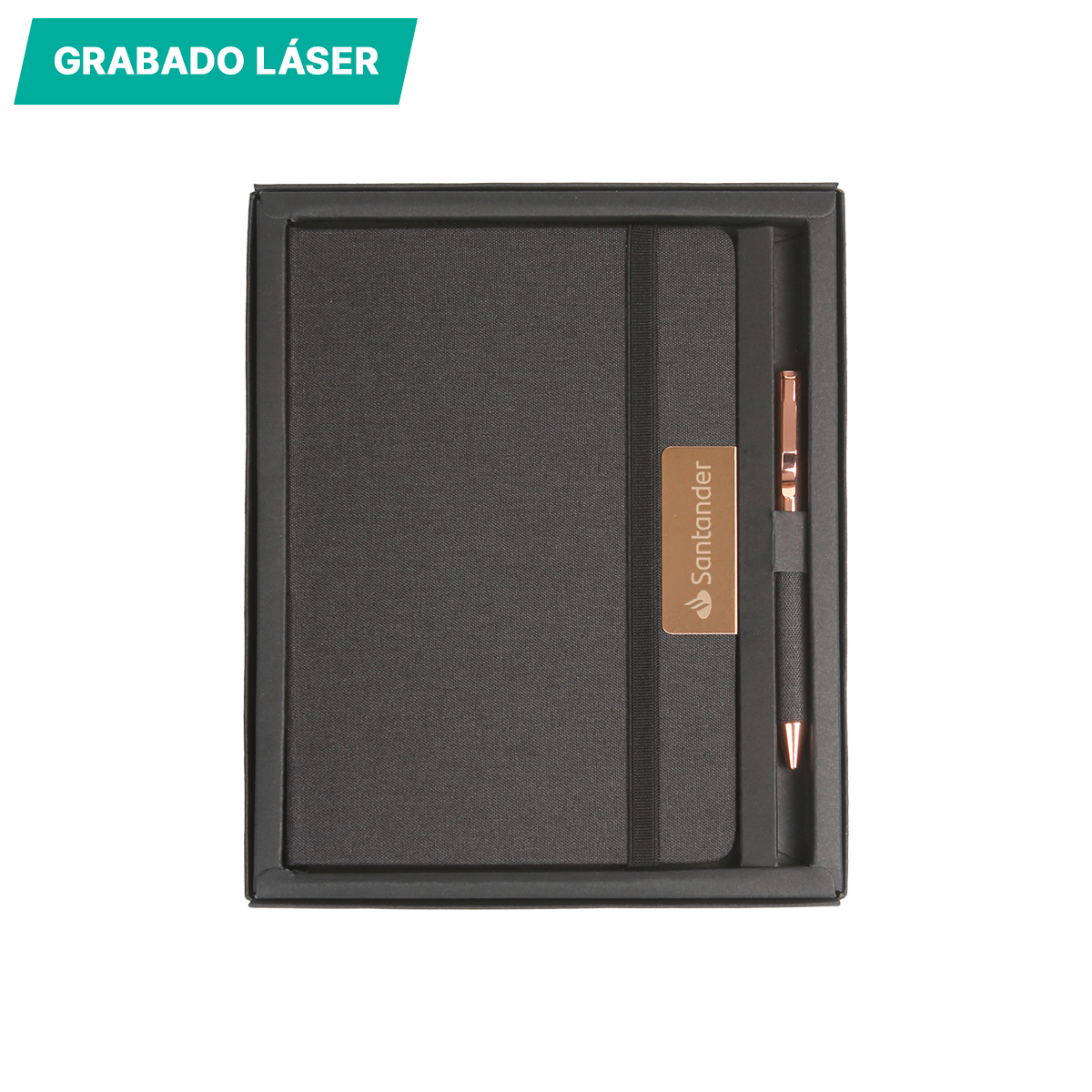 Descripción | Set ejecutivo, incluye libreta con cubierta fabricada en PET reciclado, tamaño 21x14.5 cm, con 80 hojas rayadas de 70g, un bolígrafo fabricado en acero inoxidable y detalles en PET reciclado con tinta de escritura negra. Set empaquetado en caja de regalo con diseño ejecutivo y espacio adecuado para guardar bolígrafo y libreta. |